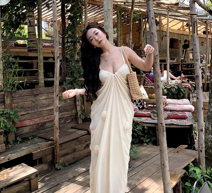 肉装小cherry 甜心月神 度假风微胖自带胸垫飘逸感花朵褶皱连衣裙