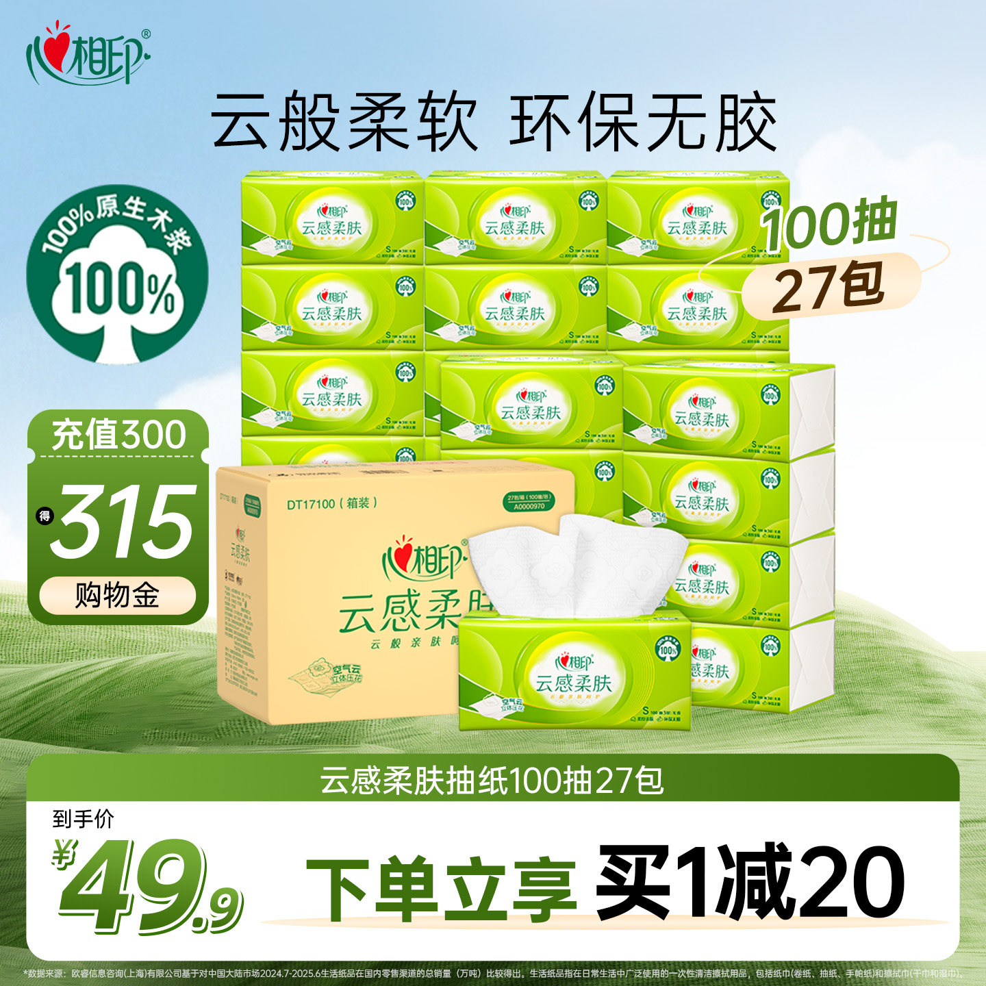 心相印抽纸云感柔肤面巾纸巾卫生纸100抽20包餐巾纸抽取式纸巾
