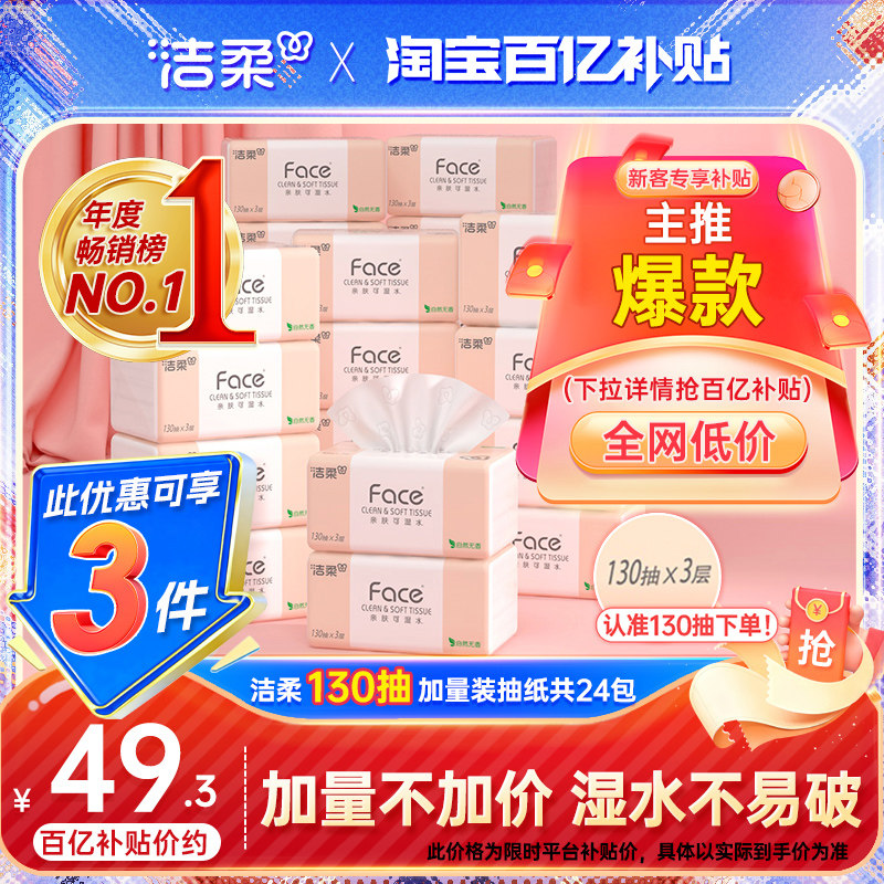 洁柔纸巾face抽纸130抽24包家用卫生纸整箱擦手面巾纸实惠餐巾纸