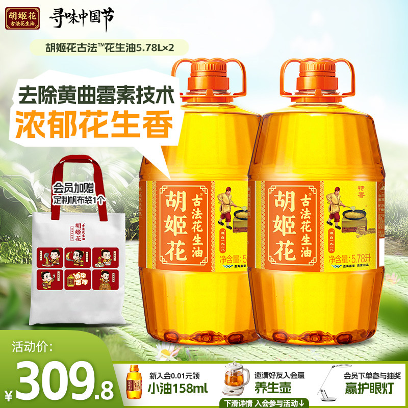 【省钱囤货】胡姬花古法花生油特香5.78L*2食用油大桶装一级压榨