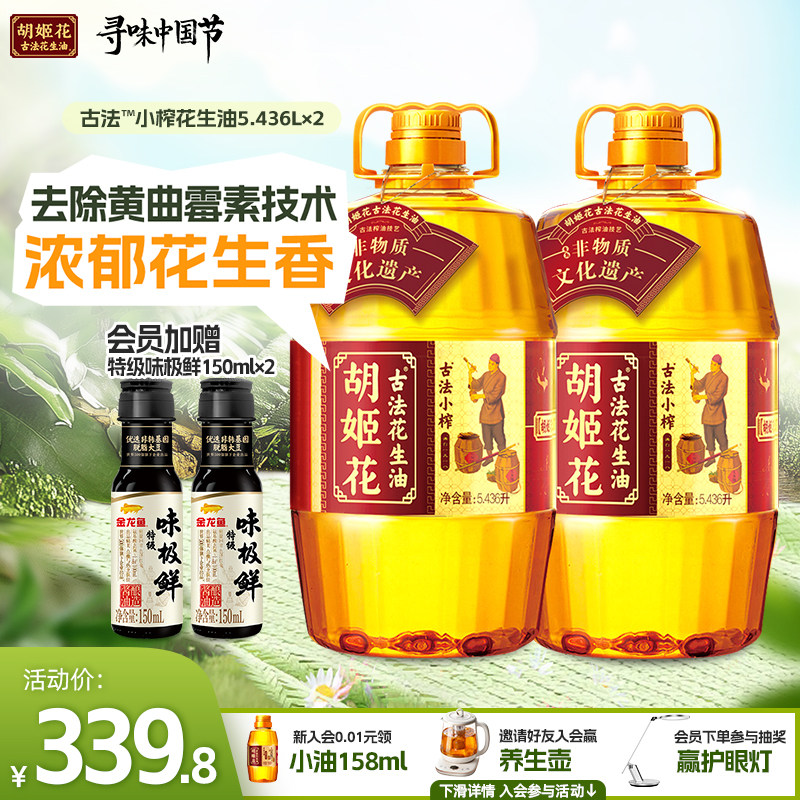 【更香更省】胡姬花古法小榨花生油5.436L*2食用油一级压榨粮油