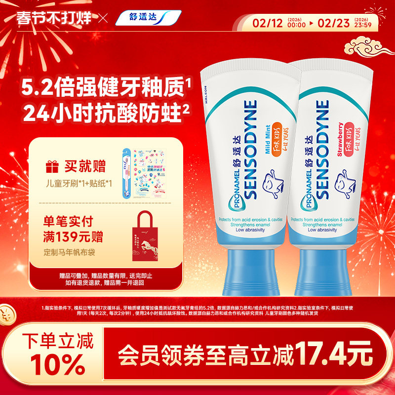【年糕妈妈同款】舒适达儿童牙膏6-12岁换牙期含氟防蛀65gx2+牙刷
