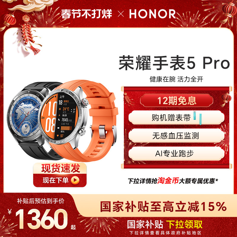 【政府补贴15%】HONOR/荣耀手表5 Pro 智能手表 支持全面心脏健康守护 无感血压监测 eSIM长续航运动手表