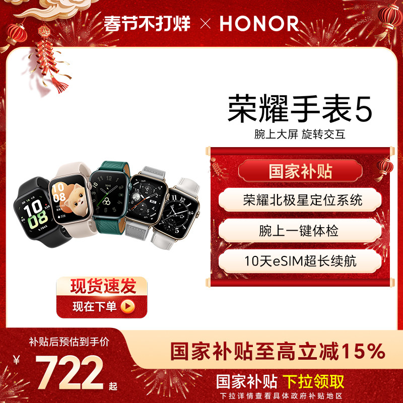 【政府补贴15%】荣耀手表5 智能运动手表 荣耀北极星定位 腕上一键体检 10天eSIM超长续航 手表