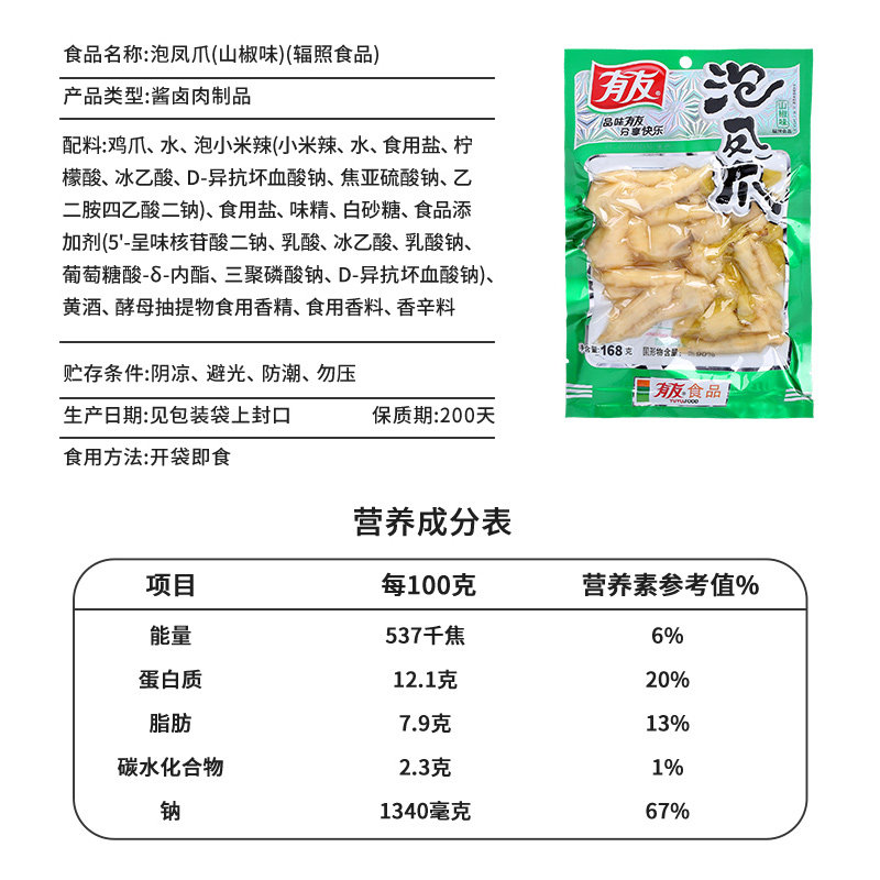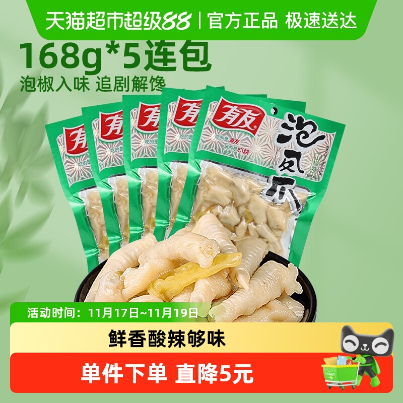 有友山椒味凤爪追剧夜宵零食168g*5包重庆特产辣解馋网红泡椒鸡爪