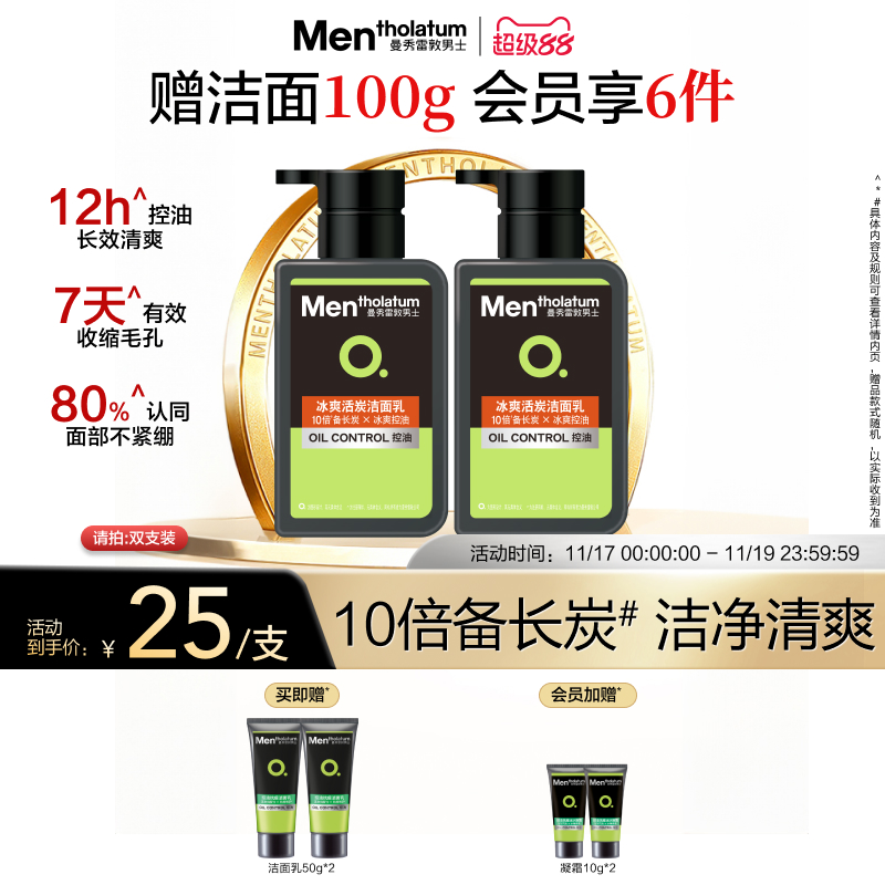 曼秀雷敦男士专用冰爽活炭洗面奶控油洁面乳冰感洁净清爽润肤官方